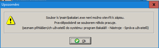 | ZN0032 | nelze vstoupit do obecné databáze Bakalář (přijímací zk., inventarizace atd.) | Do aplikace nelze vstoupit, objeví se hlášení "Databáze není platná", "Primární klíč nenalezen", "Nelze vytvořit zpětné propojení" apod. |