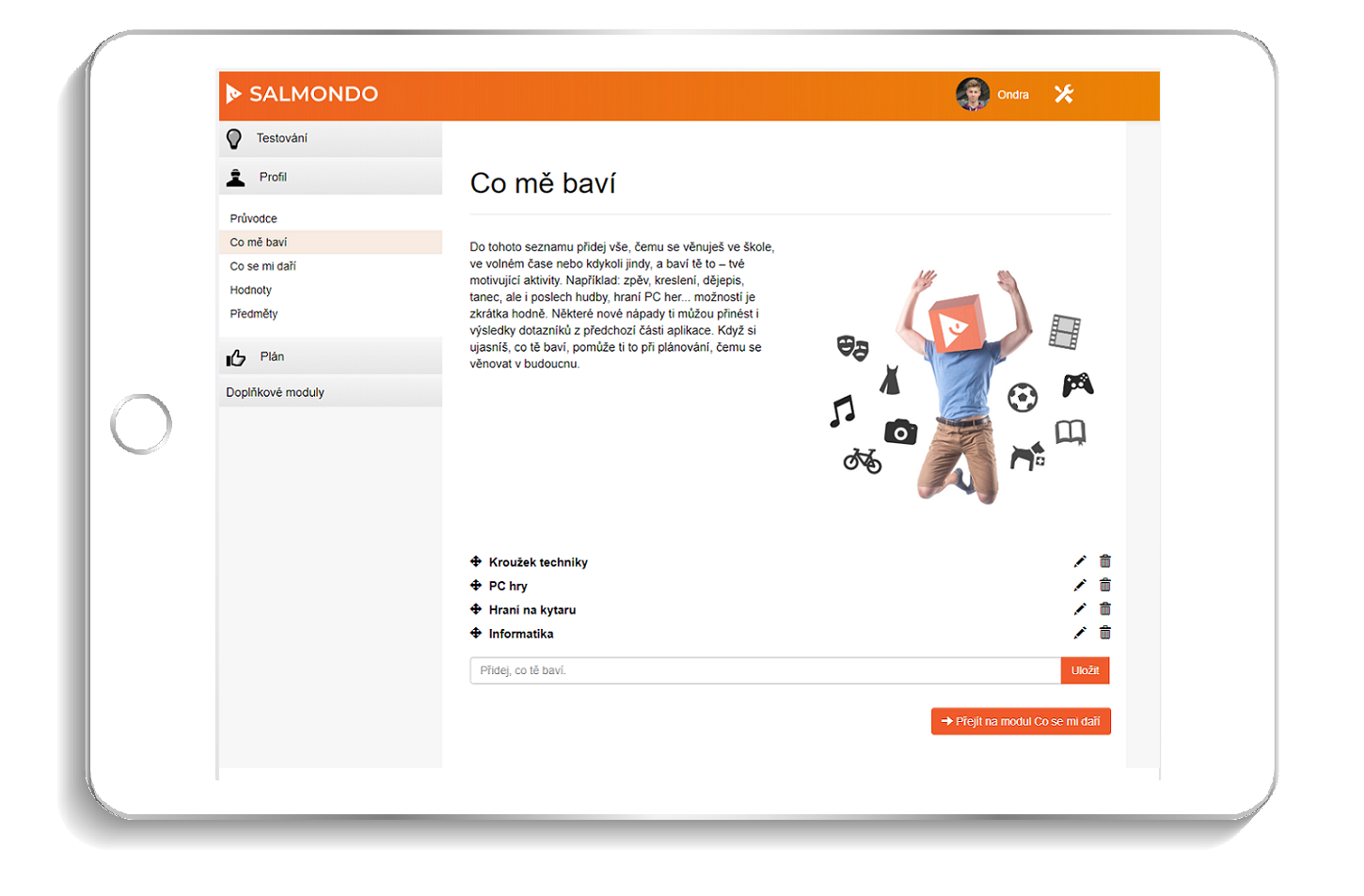Salmondo je webová pomůcka určená pro studenty základních a středních škol a jejich výchovné poradce, kterou od roku 2018 využívá již přes 200 škol z celé ČR. Díky psychologickým testům a dalším nástrojům studenti snadno zjistí, které profese a studijní obory dobře odpovídají jejich osobnostem, zájmům a silným stránkám. Aplikace je připravena tak, aby s ní žáci mohli pracovat plně samostatně, výsledky jsou však zároveň ideálním podkladem pro další výchovné a kariérní poradenství. S Bakaláři můžete získat Salmondo za výhodnější cenu.