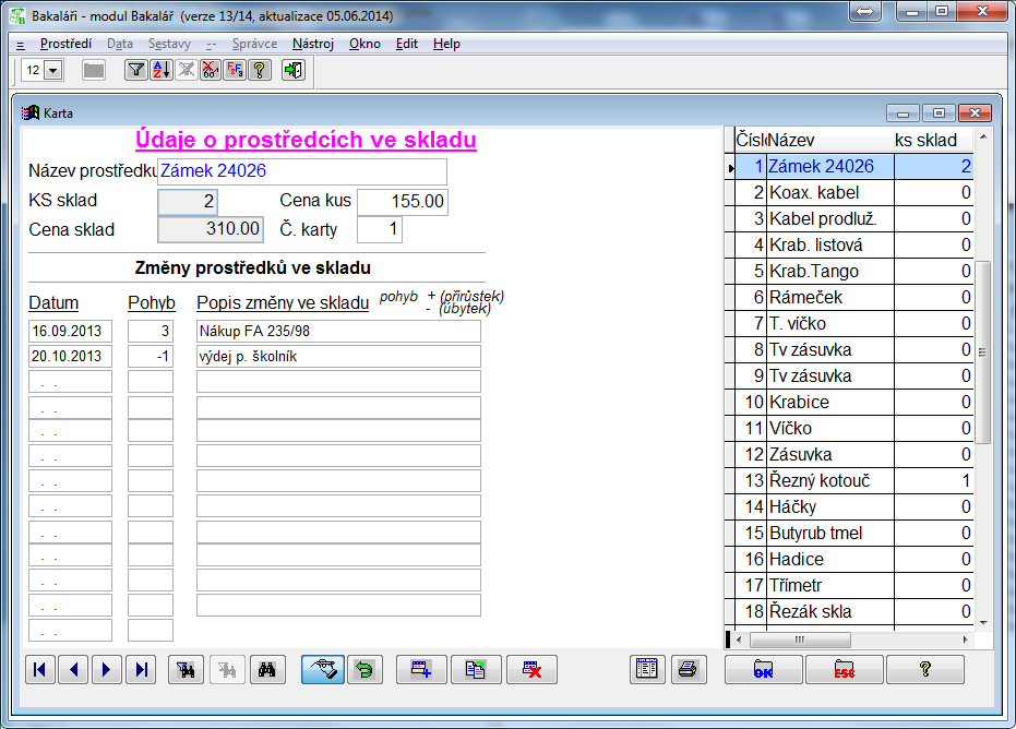 Databáze skladového hospodářství se doplňuje v obecné obrazovce, která odpovídá položkám skladové karty. Zápis stejné položky materiálu s jinou cenou se doporučuje zavést jako nová karta. Výstupy v reportech jsou skladová karta a celkový přehled (vhodné pro inventarizaci). Předností je snížení chybovosti a možnost okamžité kontroly prostředků ve skladu. Doporučuje se zavádět na škole sklad údržby a čistících prostředků. Pro sklad učebnic je vhodnější využít aplikaci knihovna.