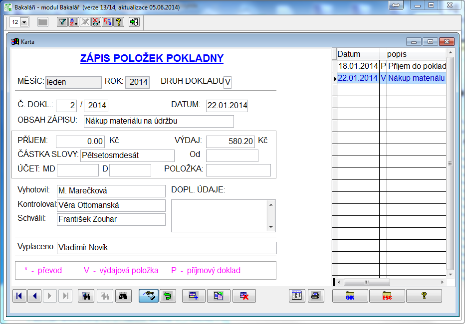 Aplikace vychází z účetních dokladů, které jsou vedeny pokladníkem. Předností je jediný zápis v obecné obrazovce. Druh dokladu je odlišen nabídkou v číselníku ("P" - příjmový doklad, "V" - výdajový doklad a "*" - se použije na převod financí do následujícího měsíce). Položky měsíc, rok a druh dokladu se využívají ve filtrech, proto je doporučeno doplňovat je z číselníku. Výstupy v reportech jsou příjmový doklad, výdajový doklad, pokladní kniha za rok a pokladní kniha za měsíc.