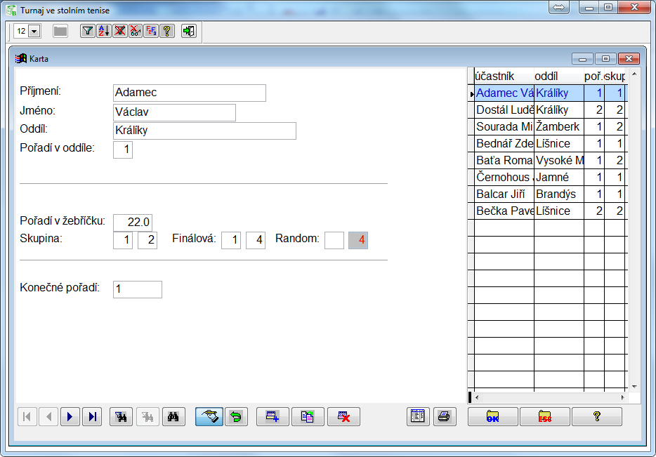 Hráče lze kromě standardního zápisu vybrat z číselníku stiskem Ctrl+M v poli příjmení. V číselníku jsou hráči z tabulky zebricek.dbf