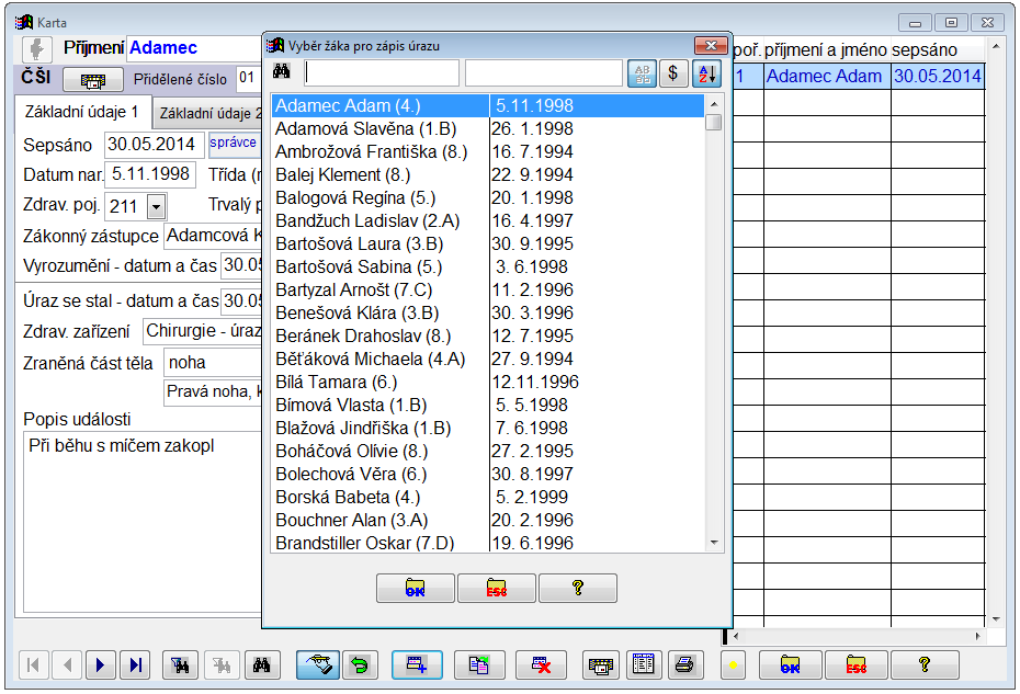 Po přidání nového úrazu se zobrazí abecední seznam žáků školy z Evidence žáků (je-li v INI souboru nastaveno AUTOCLICK=1, v opačném případě je třeba seznam vyvolat tlačítkem s obrázkem žáka v kartě vlevo nahoře).