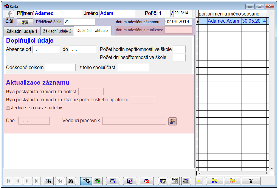 Záložka Doplnění - aktualizace se vyplňuje pouze u úrazů, které vyžadují nepřítomnost žáka ve škole a popř. pokud se záznam aktualizuje.